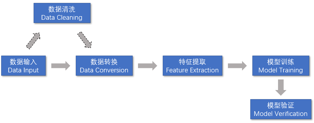 值得注意的是,在数据输入和数据转换之间,有时需要进行数据清洗。数据清洗主要是剔除错误数据和不重要的数据,从而降低模型训练的错误率。