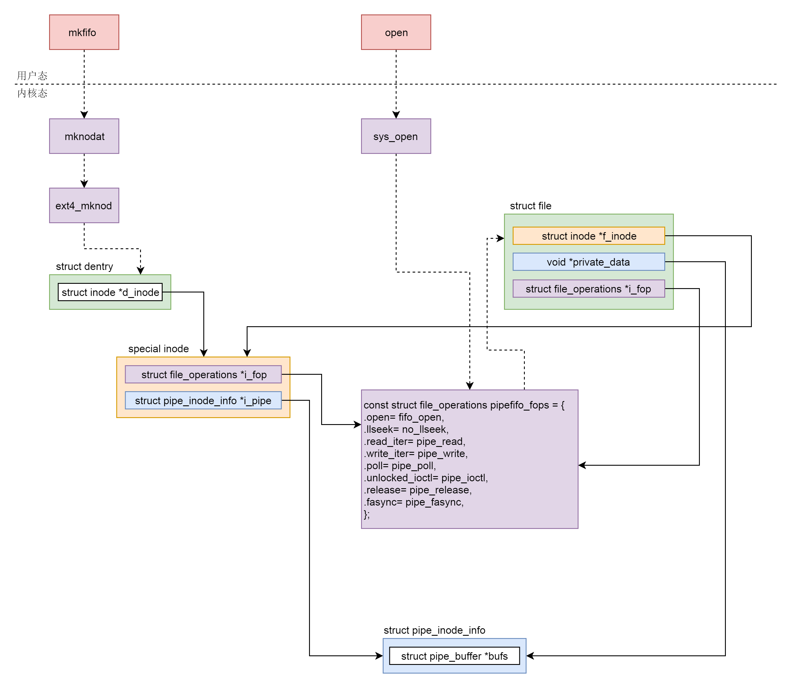 在ext4_mknod中,ext4_new_inode_start_handle会调用__ext4_new_inode,在ext4文件系统上真的创建一个文件,但是会调用init_special_inode,创建一个内存中特殊的inode,这个函数我们在字符设备文件中也遇到过,只不过当时inode的i_fop指向的是def_chr_fops,这次换成管道文件了,inode的i_fop变成指向pipefifo_fops,这一点和匿名管道是一样的。