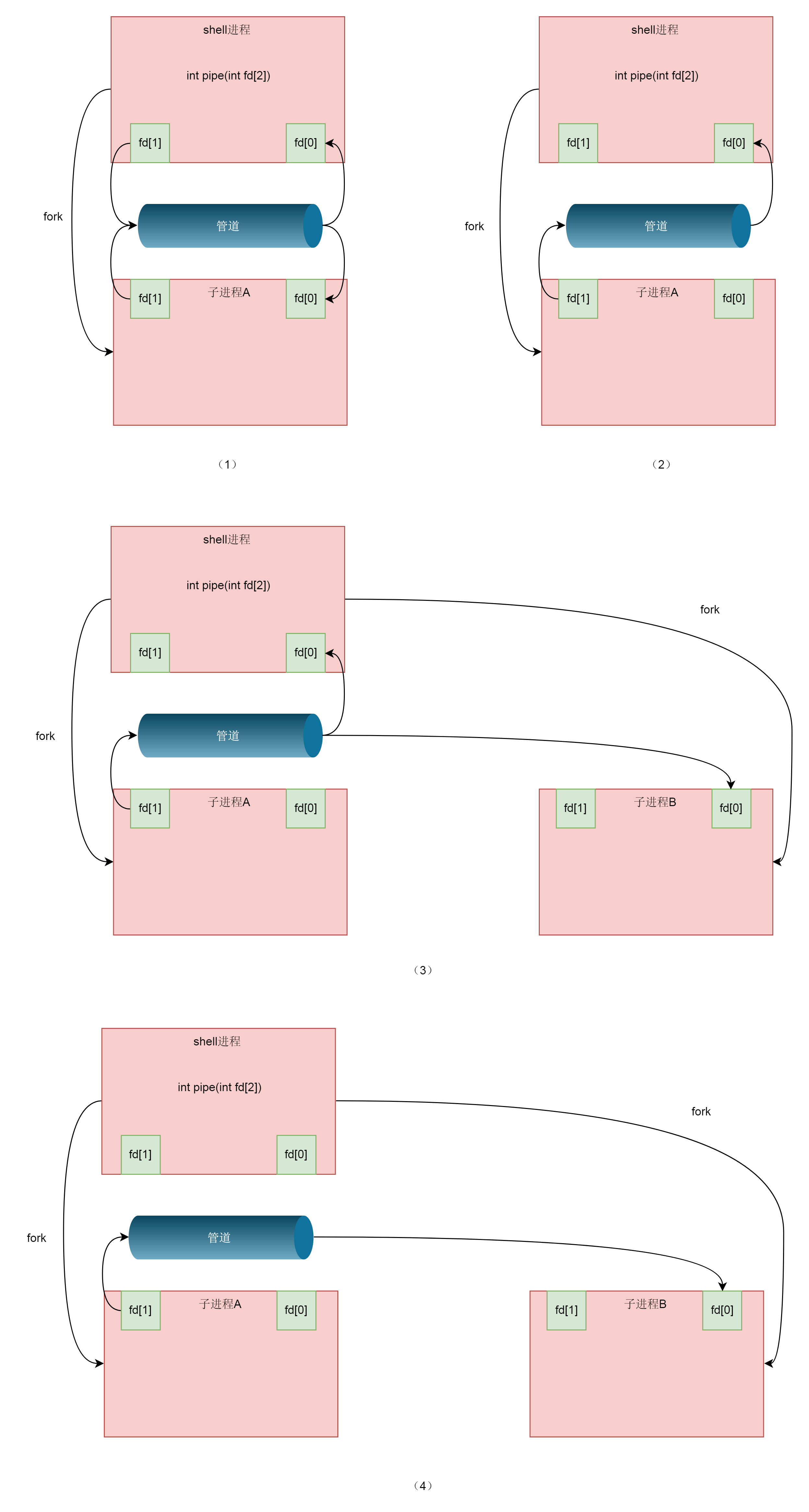 我们首先从shell创建子进程A,然后在shell和A之间建立一个管道,其中shell保留读取端,A进程保留写入端,然后shell再创建子进程B。这又是一次fork,所以,shell里面保留的读取端的fd也被复制到了子进程B里面。这个时候,相当于shell和B都保留读取端,只要shell主动关闭读取端,就变成了一管道,写入端在A进程,读取端在B进程。