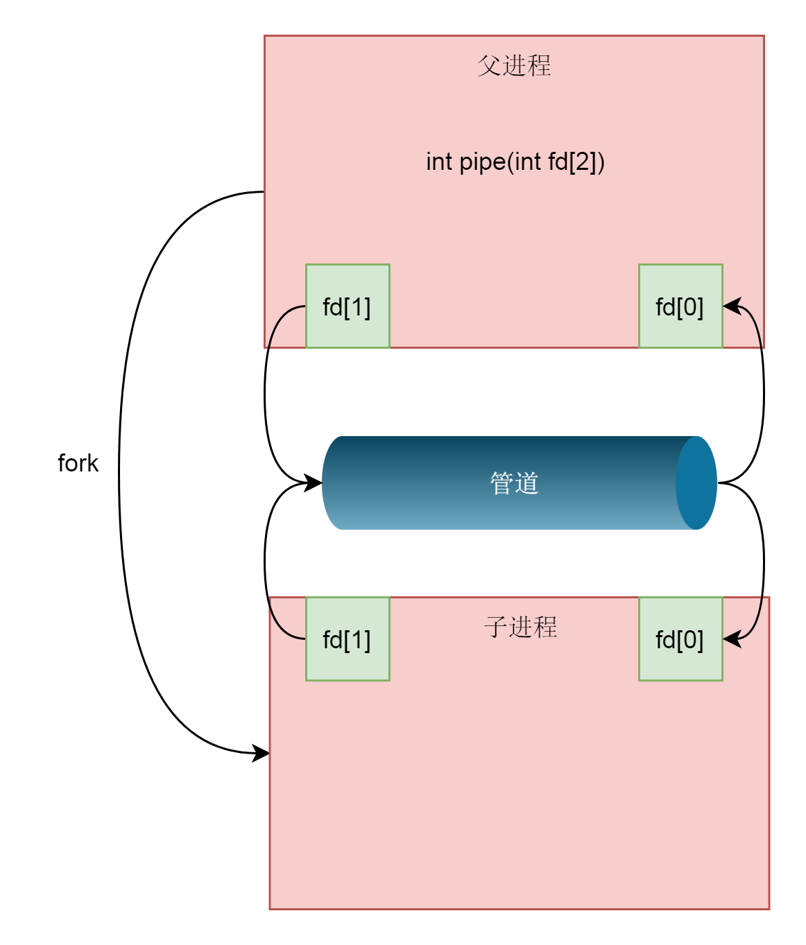 在这里,我们创建了一个管道pipe,返回了两个文件描述符,这表示管道的两端,一个是管道的读取端描述符fd[0],另一个是管道的写入端描述符fd[1]。