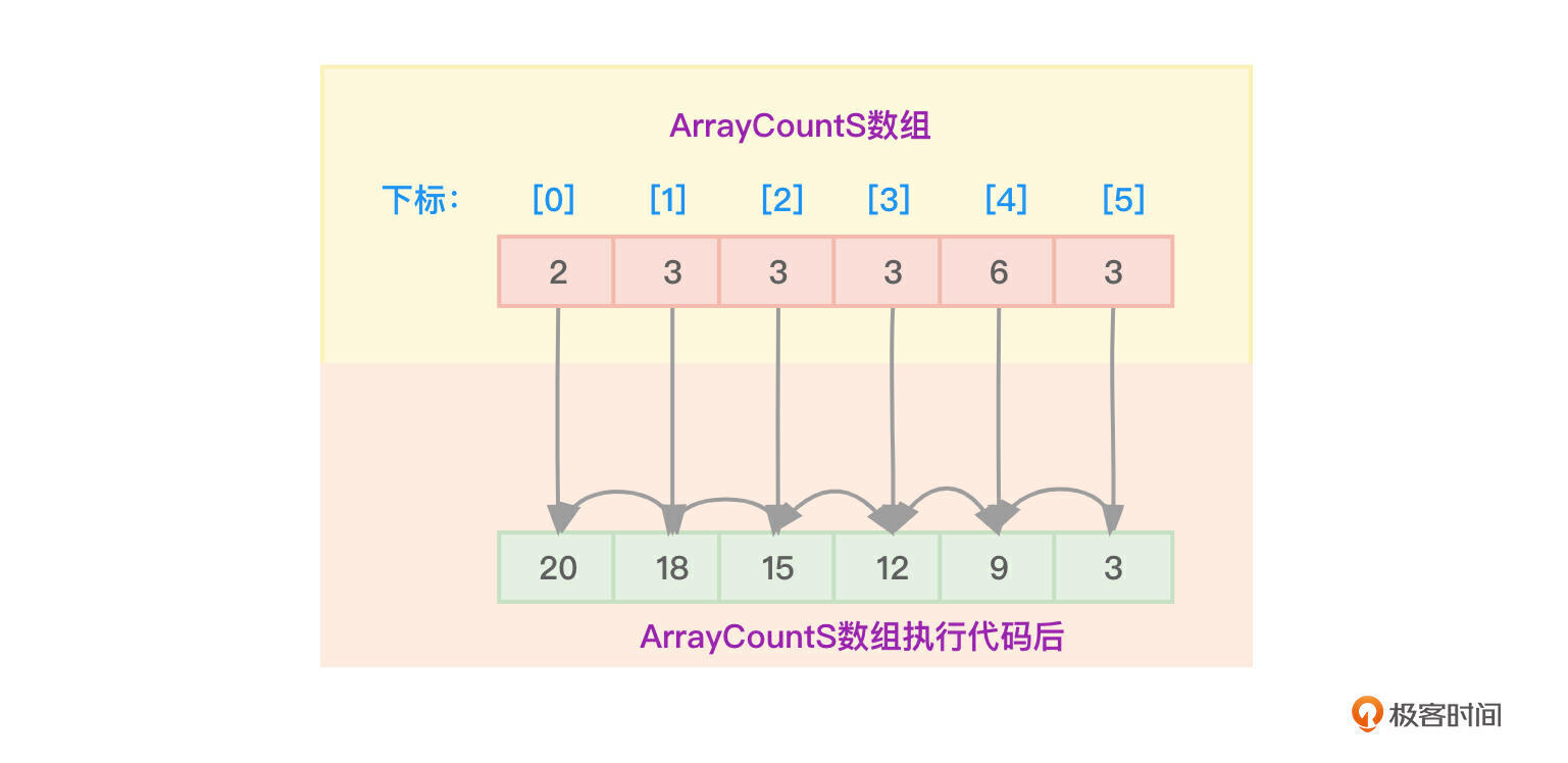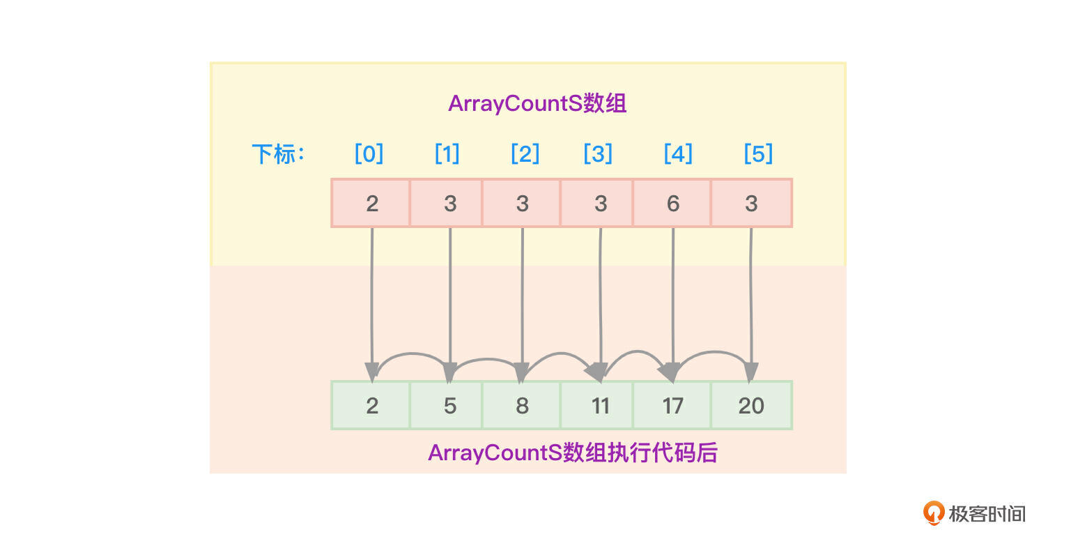 现在,如果对图1的计数数组接着执行如下代码,看一看该计数数组的内容会有什么变化?