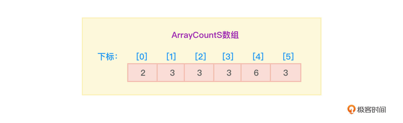 按照前面实现的计数排序代码,引入计数数组ArrayCountS,大小为6就足够了。然后开始计数。计数的结果应该是: