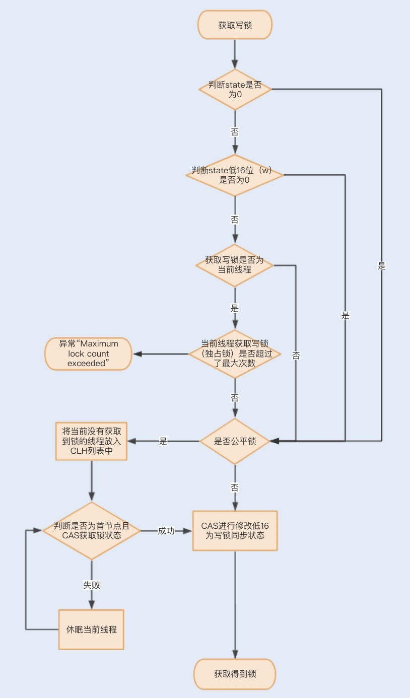 此时再判断同步状态state的低16位(w)是否为0,如果w为0,则说明其它线程获取了读锁,此时进入CLH队列进行阻塞等待;如果w不为0,则说明其它线程获取了写锁,此时要判断获取了写锁的是不是当前线程,若不是就进入CLH队列进行阻塞等待;若是,就应该判断当前线程获取写锁是否超过了最大次数,若超过,抛异常,反之更新同步状态。
