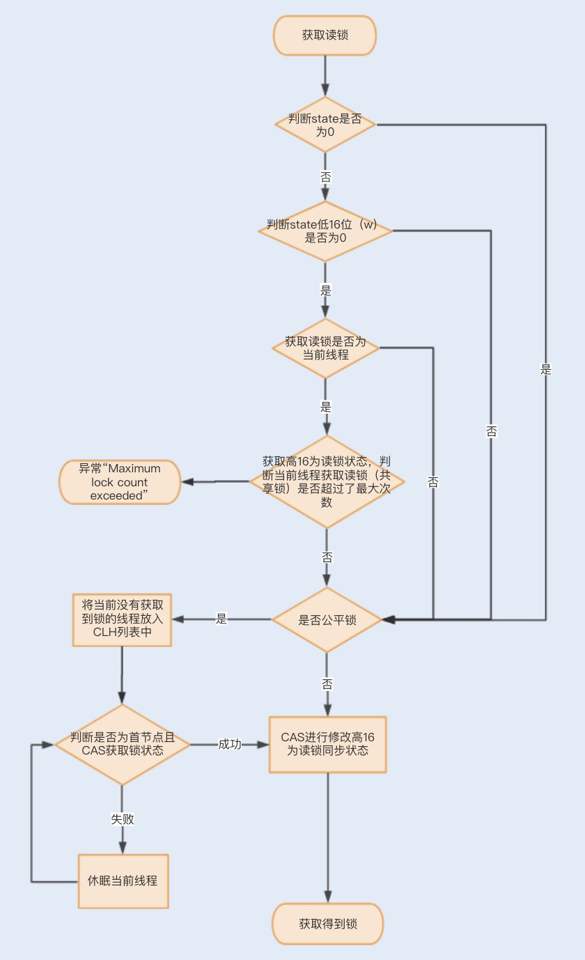 **一个线程尝试获取读锁时,**同样会先判断同步状态state是否为0。如果state等于0,说明暂时没有其它线程获取锁,此时判断是否需要阻塞,如果需要阻塞,则进入CLH队列进行阻塞等待;如果不需要阻塞,则CAS更新同步状态为读状态。