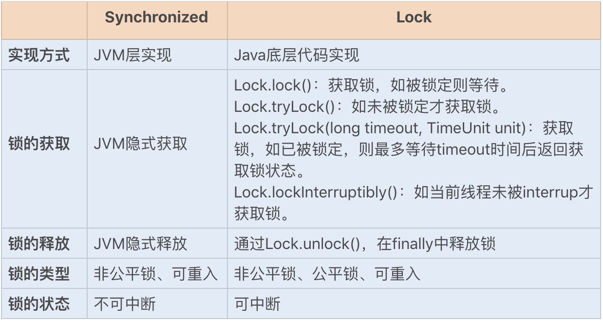 相对于需要JVM隐式获取和释放锁的Synchronized同步锁,Lock同步锁(以下简称Lock锁)需要的是显示获取和释放锁,这就为获取和释放锁提供了更多的灵活性。Lock锁的基本操作是通过乐观锁来实现的,但由于Lock锁也会在阻塞时被挂起,因此它依然属于悲观锁。我们可以通过一张图来简单对比下两个同步锁,了解下各自的特点: