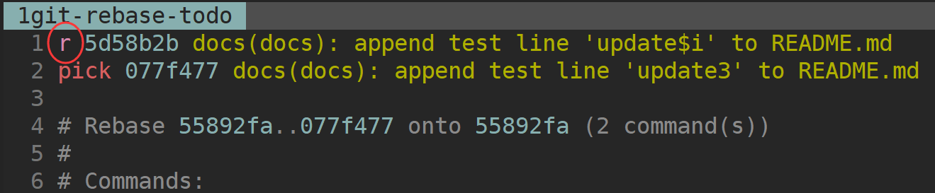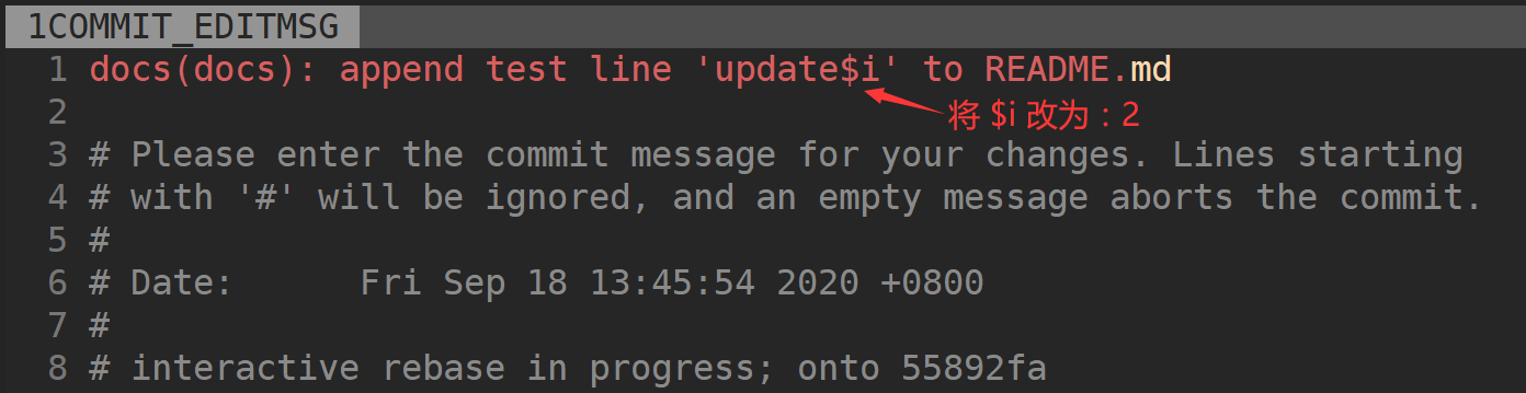 可以看到倒数第 3 次提交的 Commit Message 是:docs(docs): append test line 'update$i' to README.md,其中 update$i 正常应该是 update2。