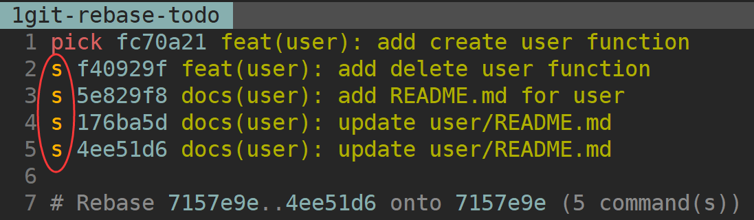 git rebase -i <commid ID>这里的一定要是需要合并 commit 中最旧 commit 的父 commit ID。- 我们希望将 feature/user 分支的 5 个 commit 合并到一个 commit,在 git rebase 时,需要保证其中最新的一个 commit 是 pick 状态,这样我们才可以将其他 4 个 commit 合并进去。