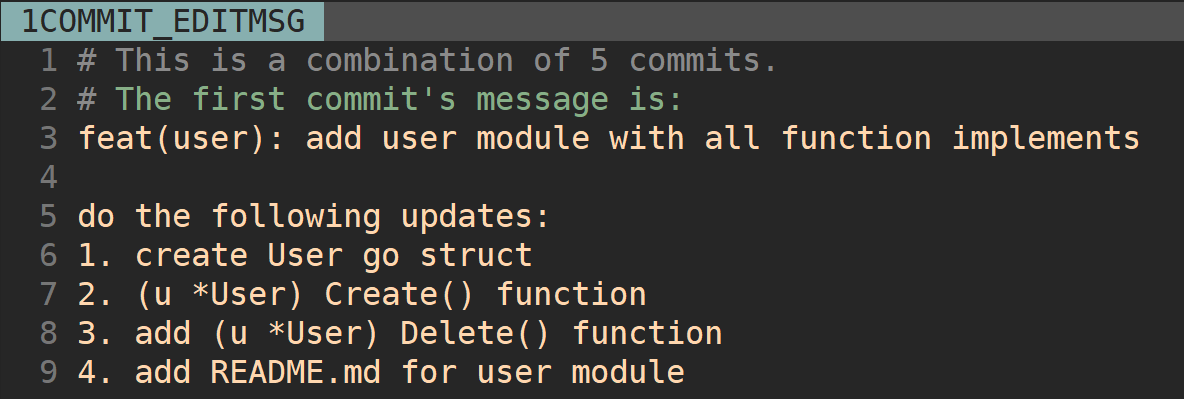 #开头的行是 git 的注释,我们可以忽略掉,在 rebase 后,这些行将会消失掉。修改完成后执行:wq 保存,就完成了合并提交操作。