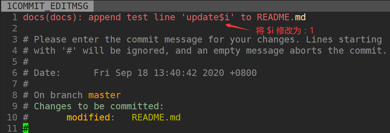 可以看到,最近一次的 Commit Message 是 docs(docs): append test line 'update$i' to README.md,其中 update$i 正常应该是 update1。