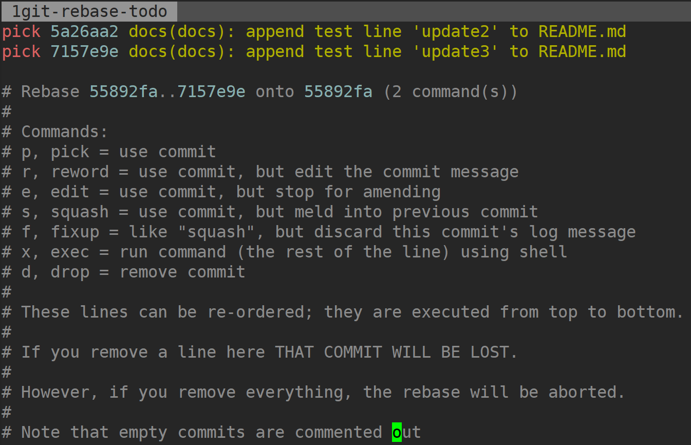 - 删除所有的 commit 行,则 rebase 会被终止掉。