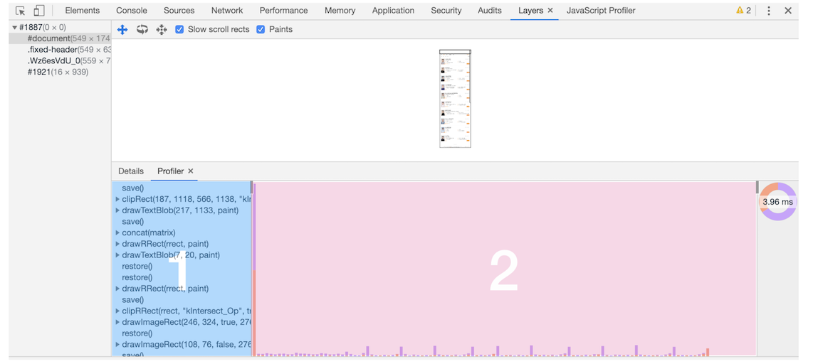 你也可以打开“开发者工具”的“Layers”标签,选择“document”层,来实际体验下绘制列表,如下图所示: