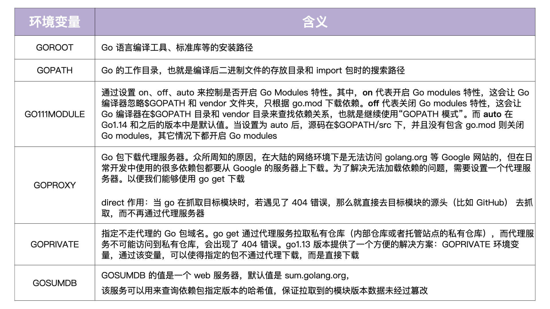 为什么要增加这么多环境变量呢?这是因为,Go 语言是通过一系列的环境变量来控制 Go 编译器行为的。因此,我们一定要理解每一个环境变量的含义。