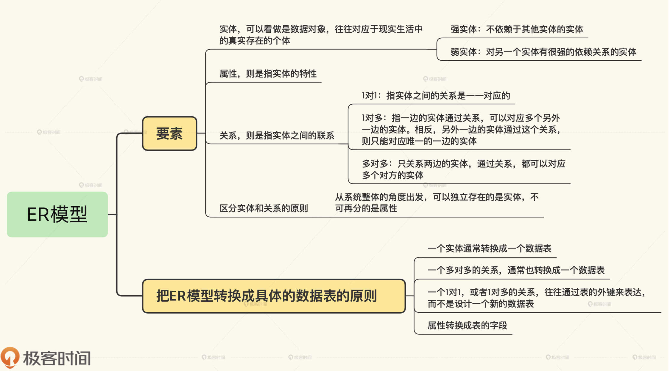 好了,下面我就结合前面的表格,给你具体讲解一下怎么运用这些转换的原则,把ER模型转换成具体的数据表,从而把抽象出来的数据模型,落实到具体的数据库设计当中。