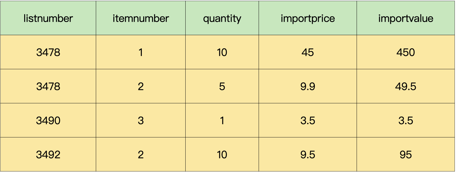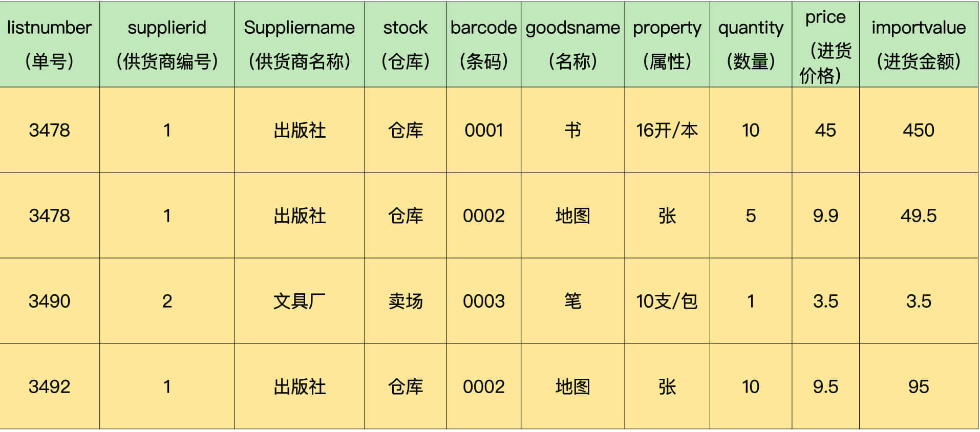 按照数据表设计的第三范式的要求和业务优先的原则,我们把这个进货单表拆分成2个表,分别是进货单头表和进货单明细表: