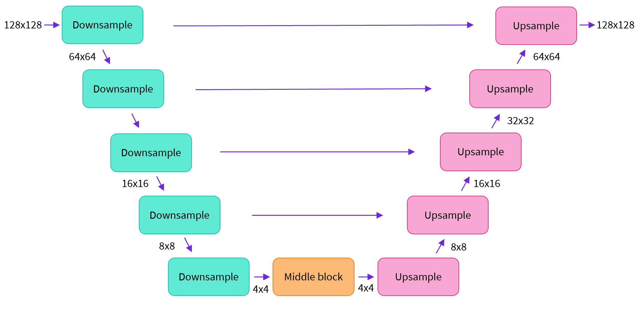 然后我们看UNet结构。按照下图的结构搭建UNet模块,比如图中输入和输出的分辨率都是128x128,在实际UNet搭建中你可以任意指定。