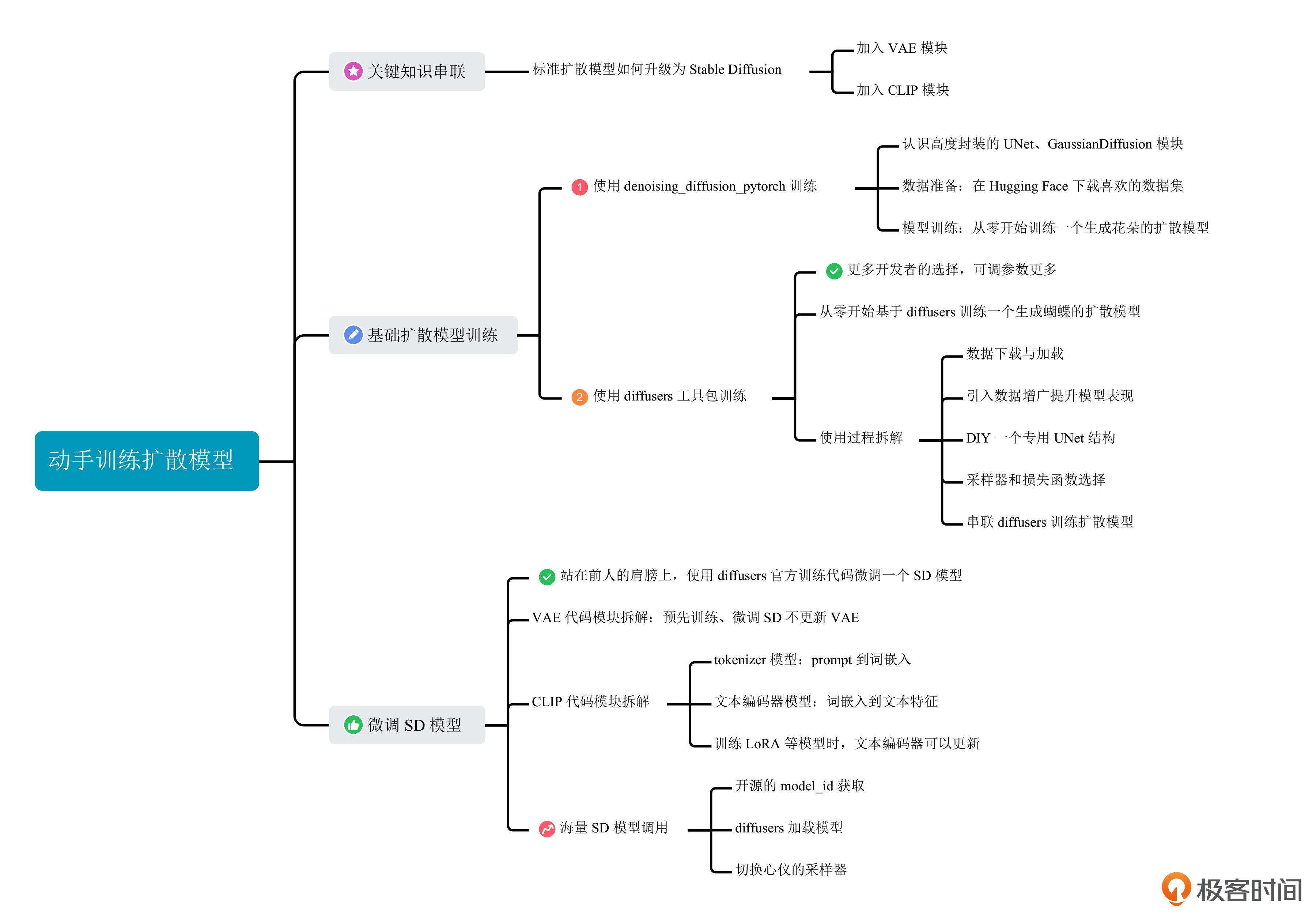 这一讲,我们会将前几讲的知识串联起来,从全局的视角讨论扩散模型如何训练和使用。我们将通过实战的形式,一起训练一个标准扩散模型,并微调一个Stable Diffusion模型,帮你进一步加深对知识的理解。学完这一讲,我们就迈出了模型自由的关键一步。