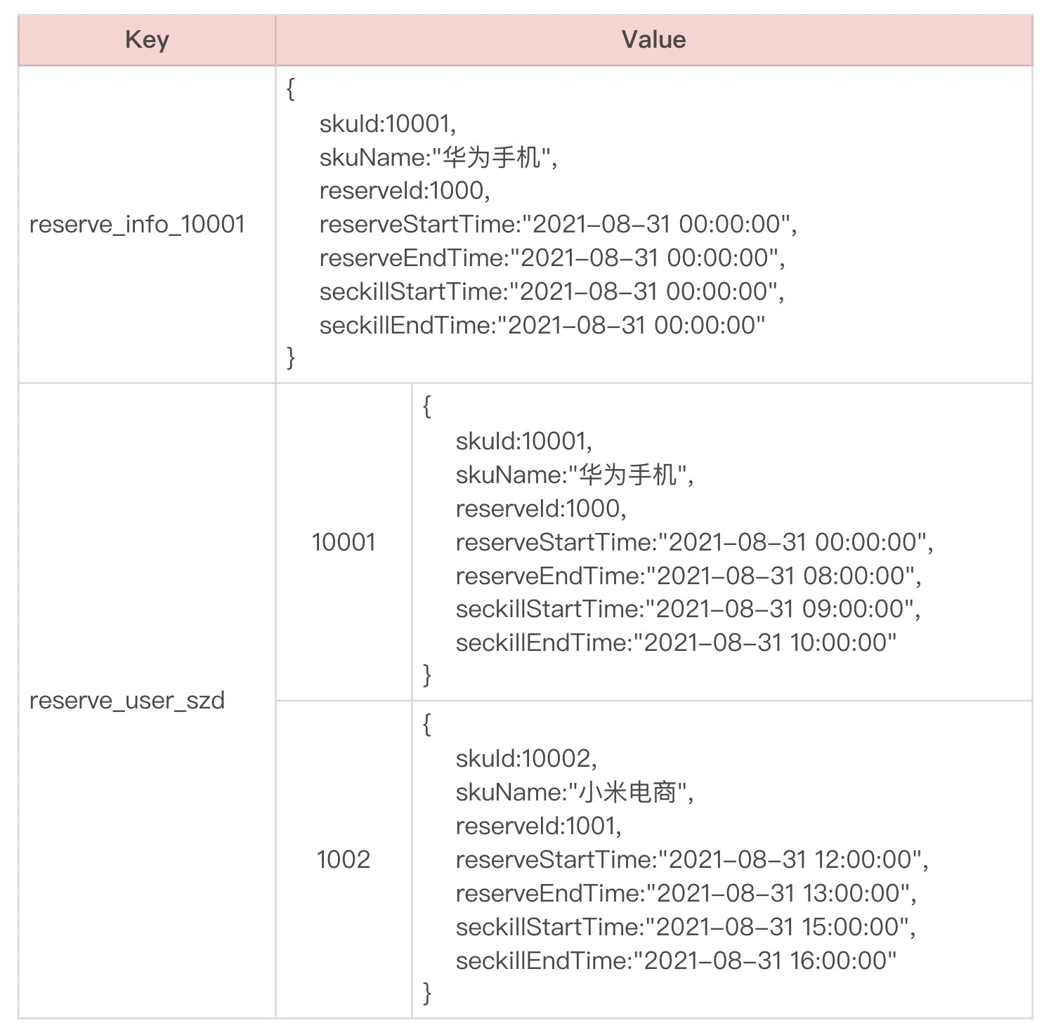 先看t_reserve_info这个对象,首先我们需要在Redis缓存里存储它,那么Redis key可以这样设计:reserve_info_{skuid},value可以用JSON string存储,当然也可以采用其他序列化方式,取决于你自己。