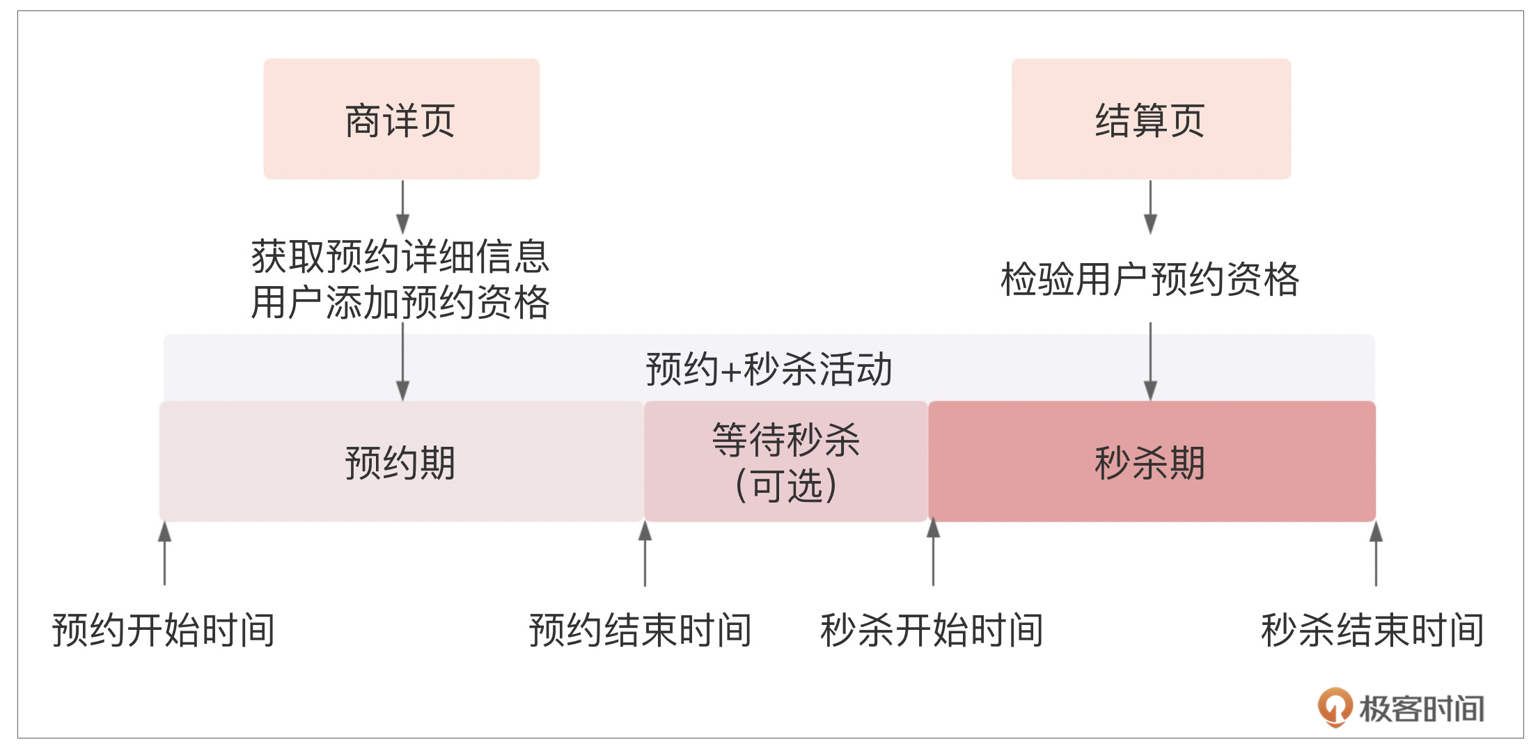 如果你关注过电商平台的双11或618大促,你肯定能感受到“预约+秒杀”在大促时的主流营销玩法。上图是预约+秒杀营销模式的示意图,主要分为预约期和秒杀期。