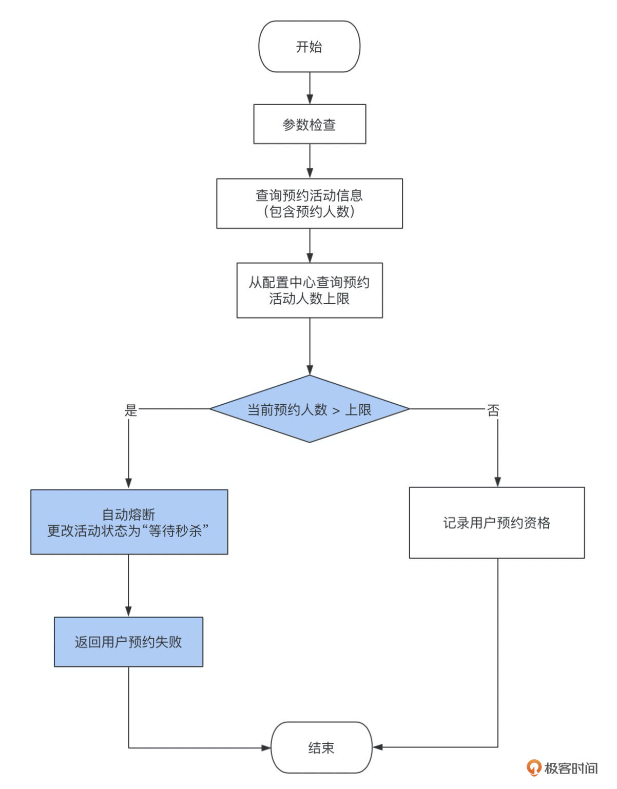 以上是预约熔断的流程图,白色部分流程是原有的用户预约过程,蓝色部分是添加了熔断机制的流程。技术方案还是比较简单的,这里更多的是给你思路上的启发,这也是我多次踩坑之后的经验总结。
