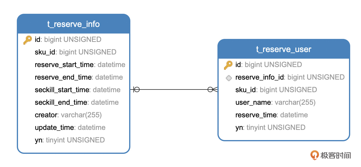 再看下数据库层的设计,对预约来讲,核心就是两个维度:预约活动和用户预约关系。因此实际上数据库层面只需要两张表就够了,一张是预约活动信息表,另一张是用户预约关系表。