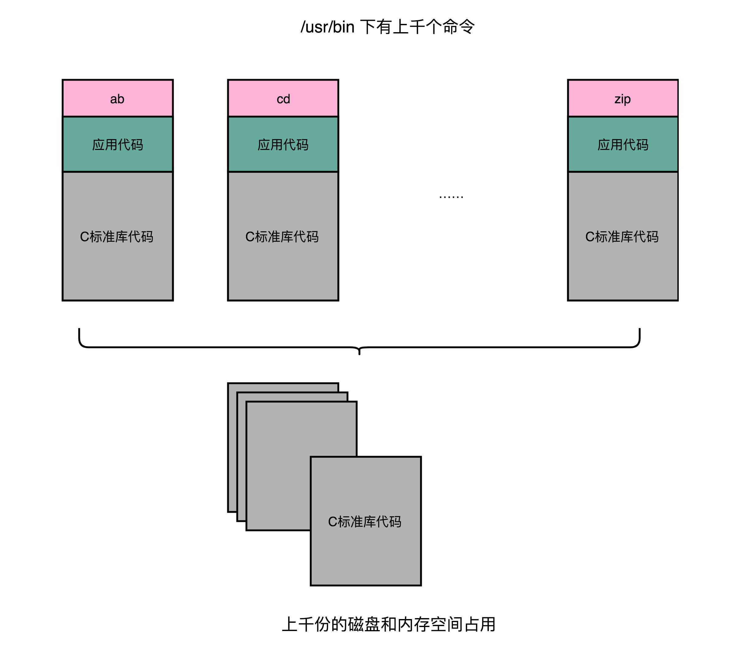 实际上,在进行Linux下的程序开发的时候,我们一直会用到各种各样的动态链接库。C语言的标准库就在1MB以上。我们撰写任何一个程序可能都需要用到这个库,常见的Linux服务器里,/usr/bin下面就有上千个可执行文件。如果每一个都把标准库静态链接进来的,几GB乃至几十GB的磁盘空间一下子就用出去了。如果我们服务端的多进程应用要开上千个进程,几GB的内存空间也会一下子就用出去了。这个问题在过去计算机的内存较少的时候更加显著。