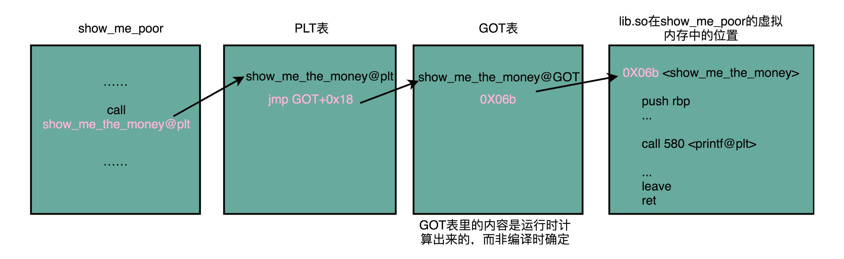 想要更加深入地了解动态链接,我推荐你可以读一读《程序员的自我修养:链接、装载和库》的第7章,里面深入地讲解了,动态链接里程序内的数据布局和对应数据的加载关系。