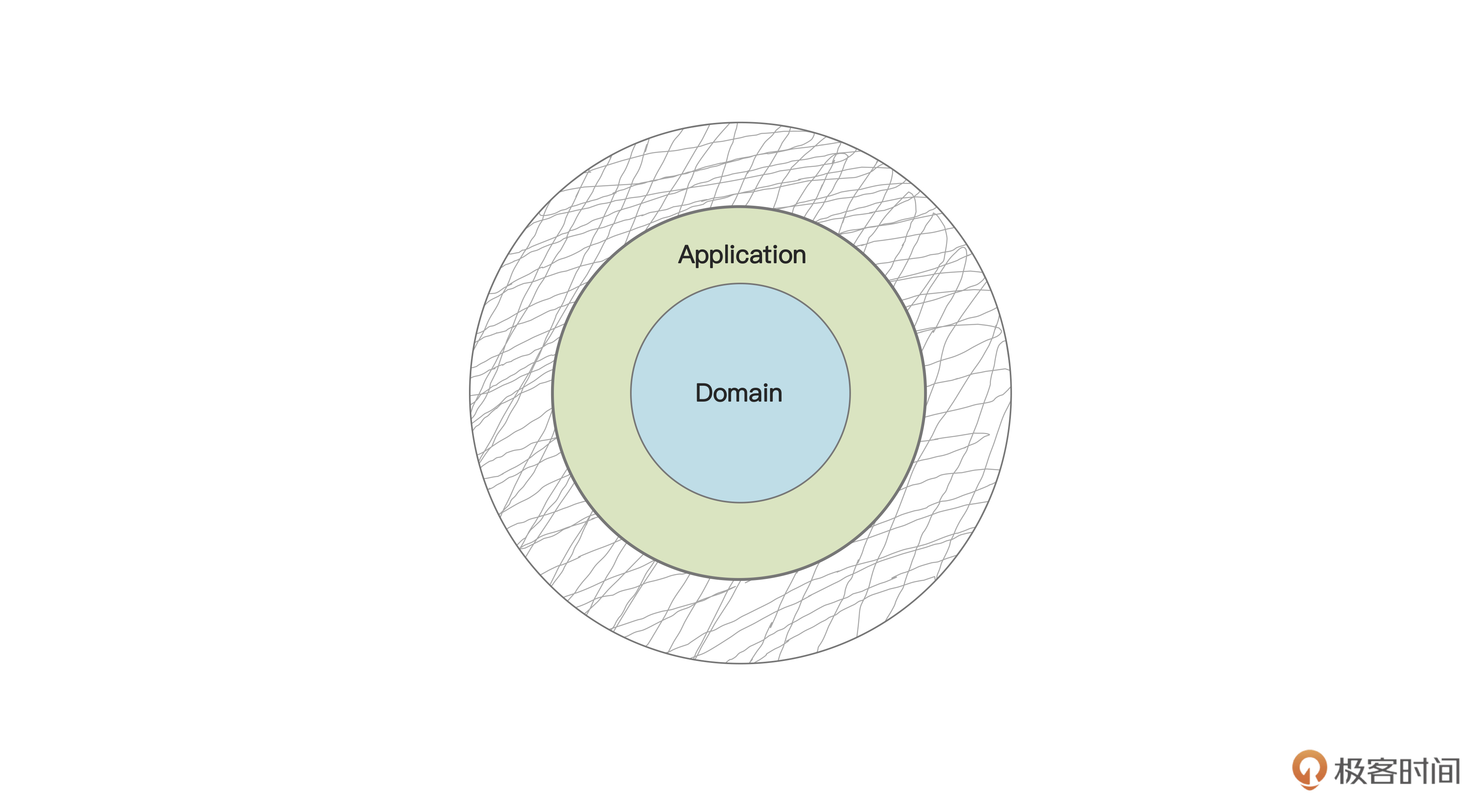 那么,领域层封装的逻辑通常是细粒度的,并不适合直接作为API暴露给外部。另外,还有一些不属于领域层的横切关注点,比如像事务控制,应该单独处理。所以,我们往往要在领域层外面再加一层,DDD和六边形架构都将这一层称为Application,也就是应用层。如下图所示: