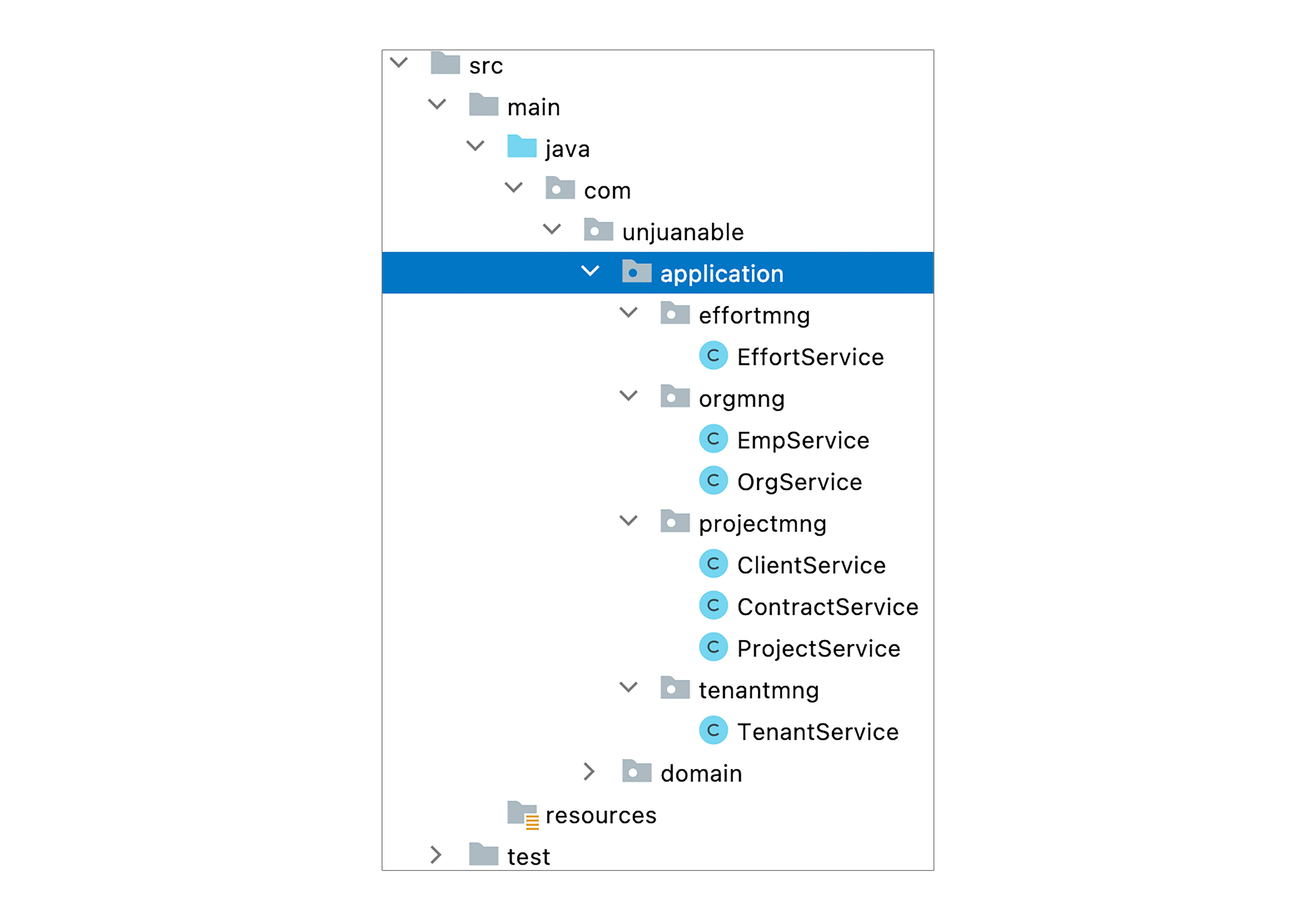 图中的Unjuanable 是项目的根,这是咱们自造的单词,就是“不要卷了”(un-juan-able)的意思,这是开个玩笑。而Effortmng、orgmng、projectmng 和tenantmng就是领域模型中的四个模块,命名还是依据之前建立的词汇表。