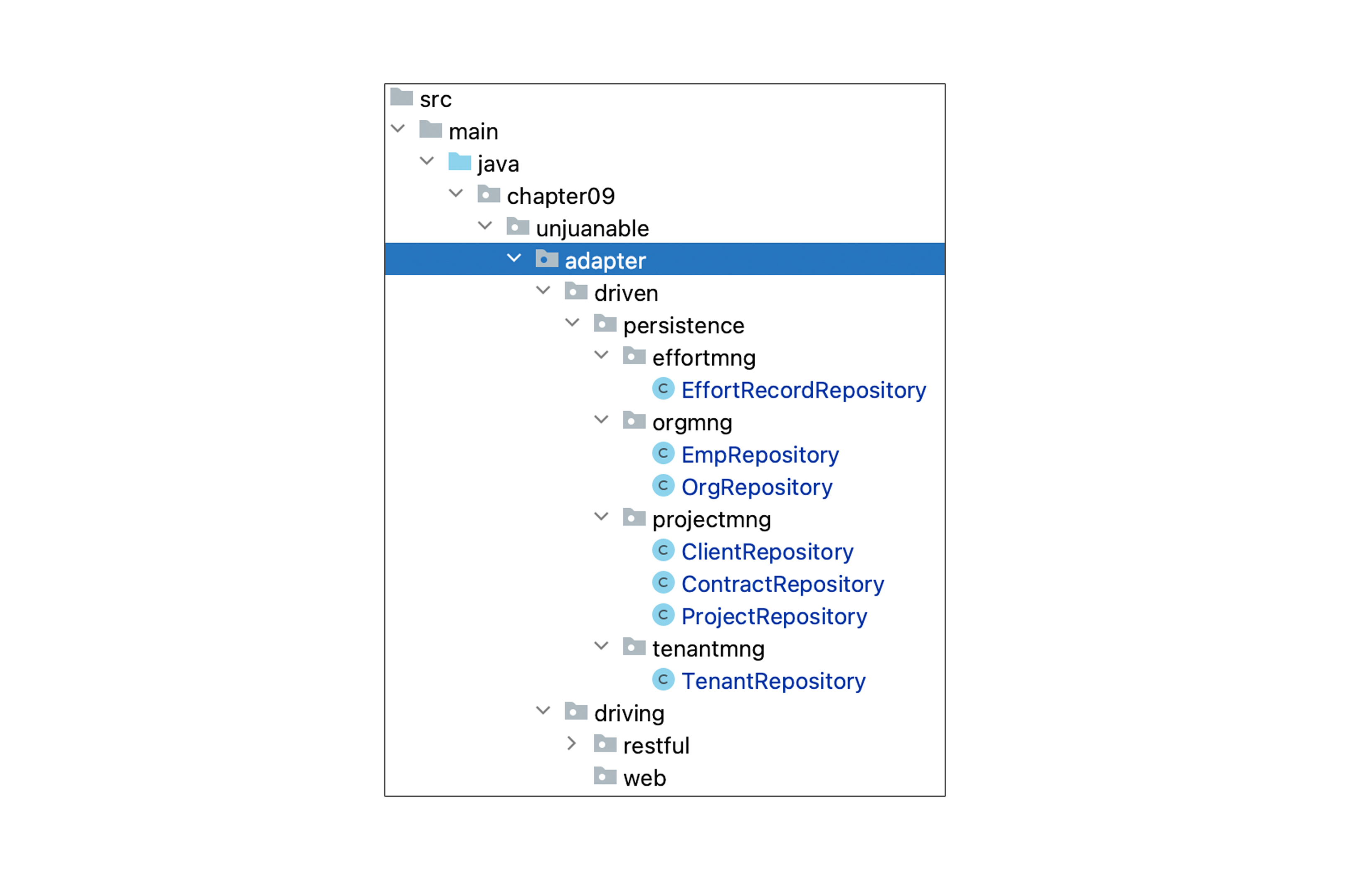 我们可以看到,adaper包被分成了driving和driven两个子包,分别代表两种适配器。在driving里还是上一节说的Controller,而driven包下的内容则是新加的。Persistence是“持久化”的意思,这个包里面就是用于持久化的各个仓库。