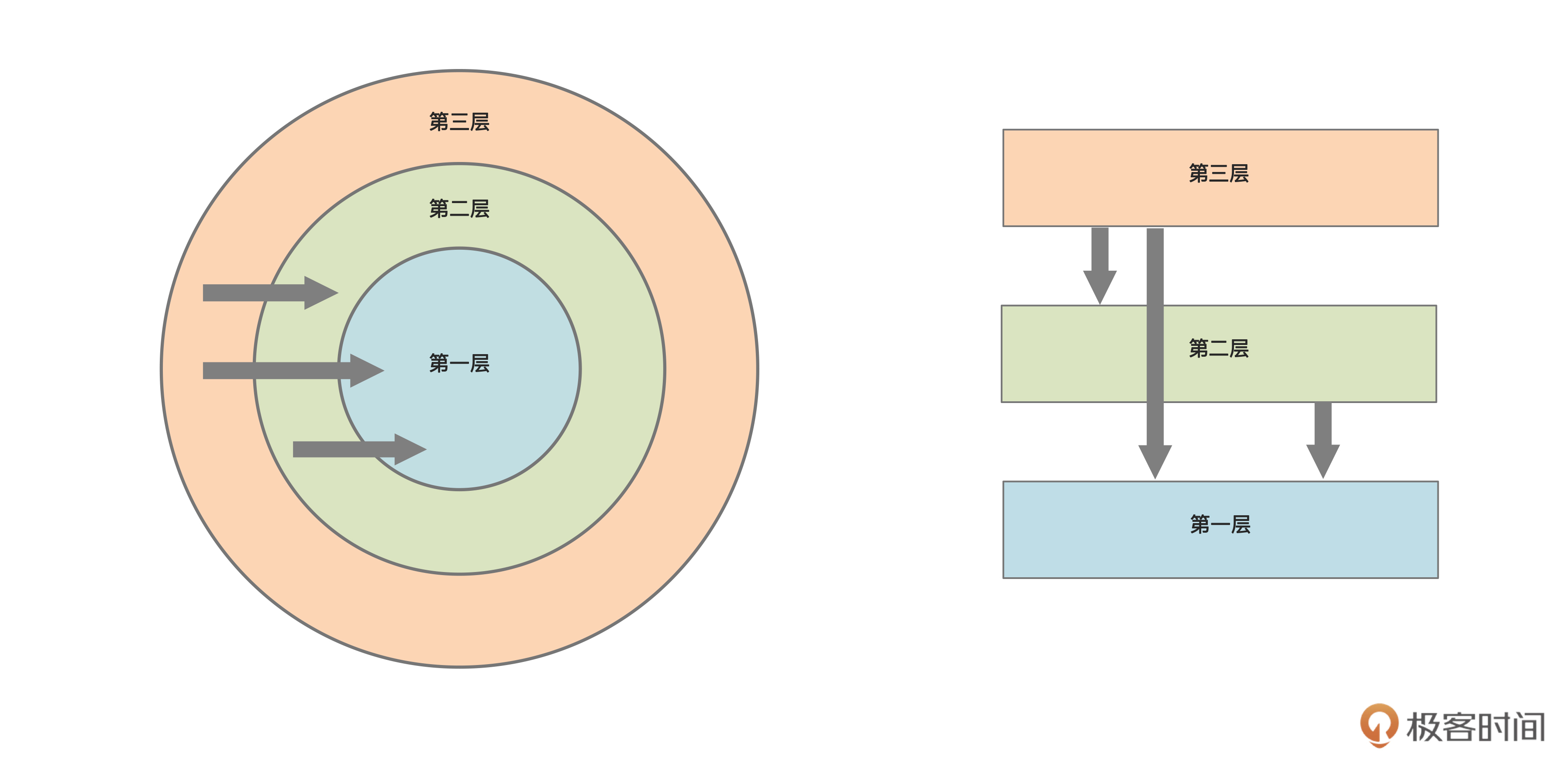 不过,目前业界用左边这种圈层结构的比较多,所以我们在课程中也采用这种画法。