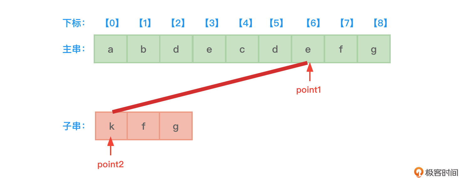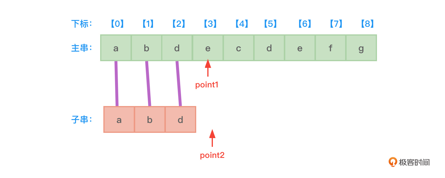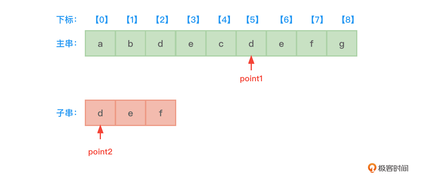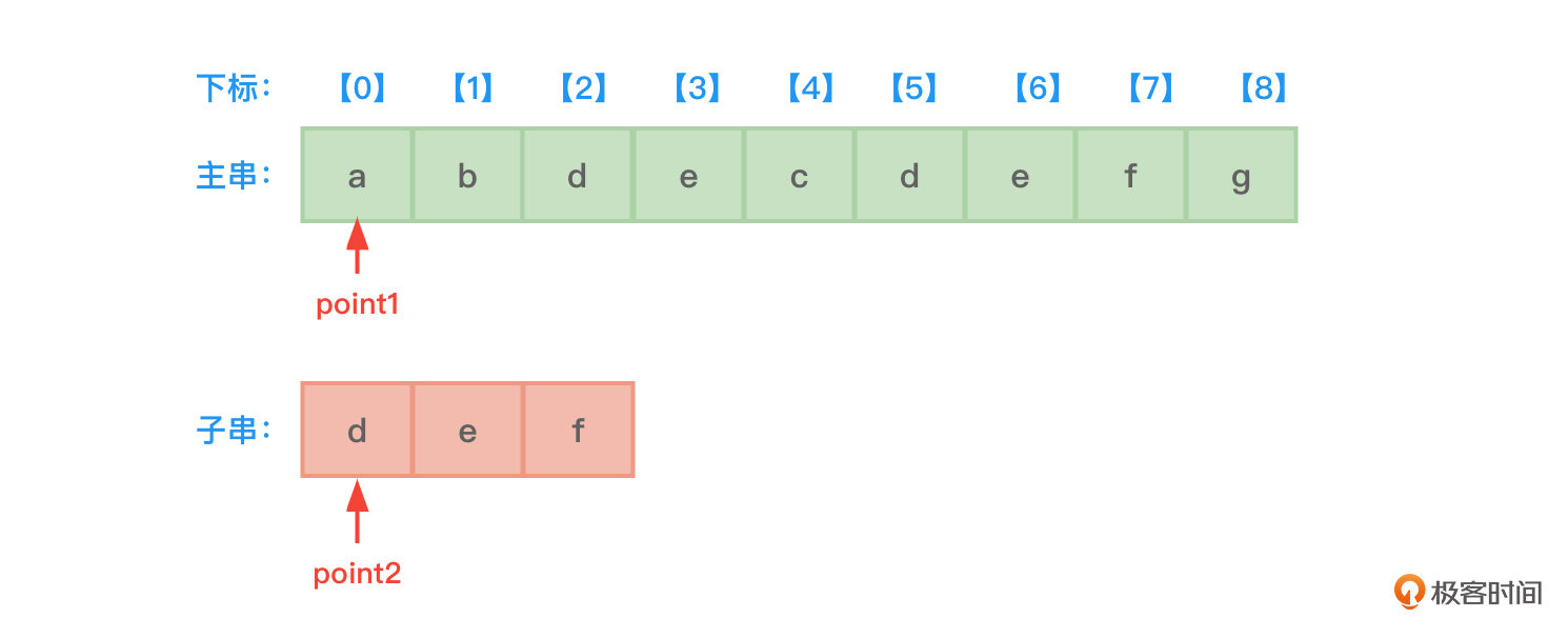 - 开始时,先设置两根指针point1和point2,分别指向主串和子串的开始地址,也就是下标0的位置。