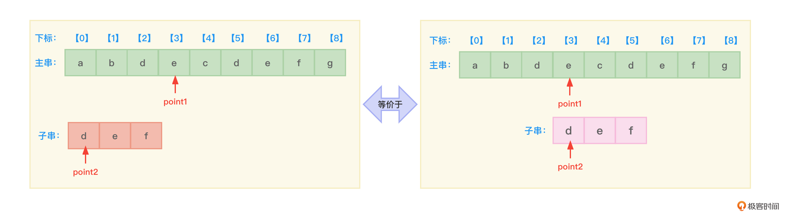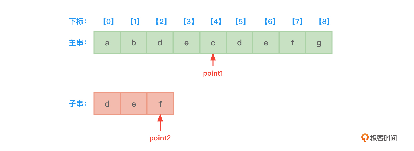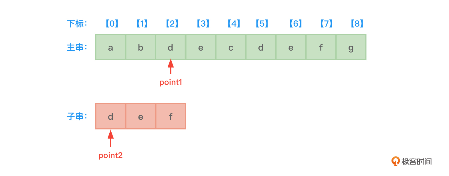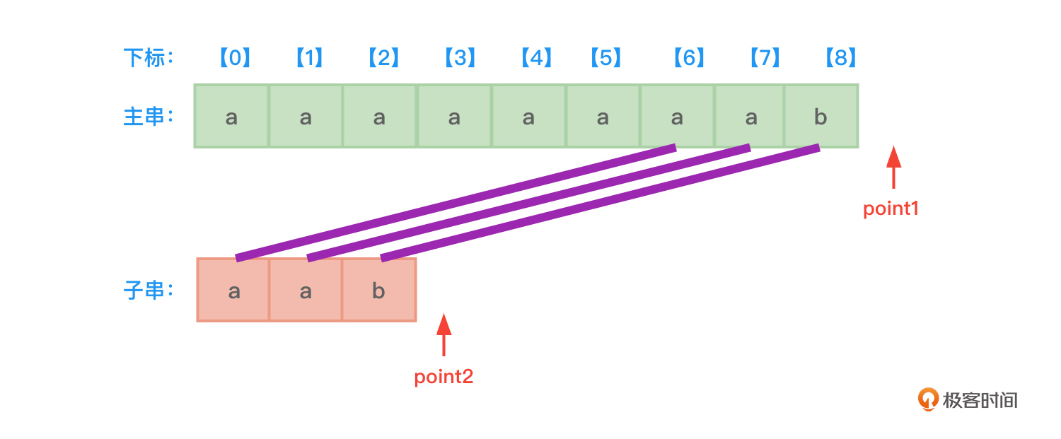 - 开始时,先设置两根指针point1和point2,分别指向主串和子串的开始地址,也就是下标0的位置。