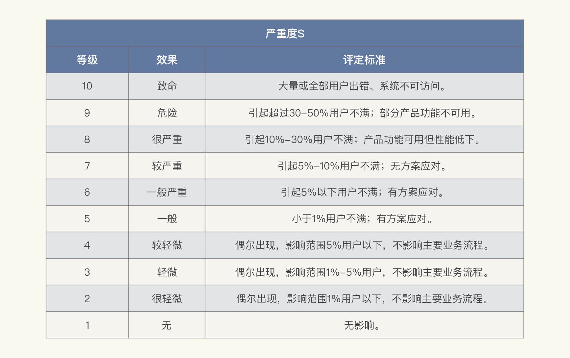 对于你自己的系统,不一定要完全照搬上面表格中对等级标准的划分,不过,逻辑还是可以借鉴的。