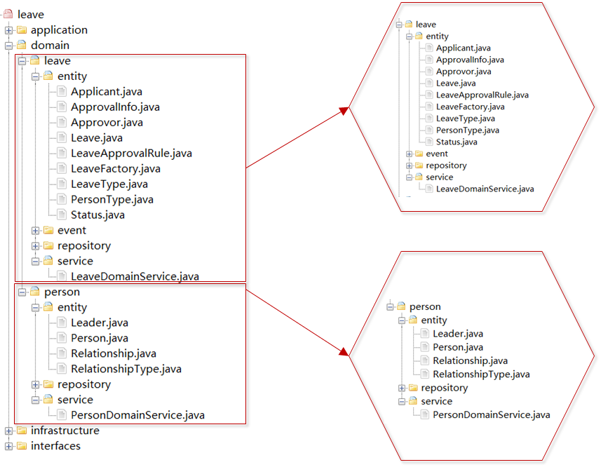 现在我们来看一个微服务实例,在下面这张图中,我们可以看到微服务里包含了两个聚合的业务逻辑,两个聚合分别内聚了各自不同的业务能力,聚合内的代码分别归到了不同的聚合目录下。