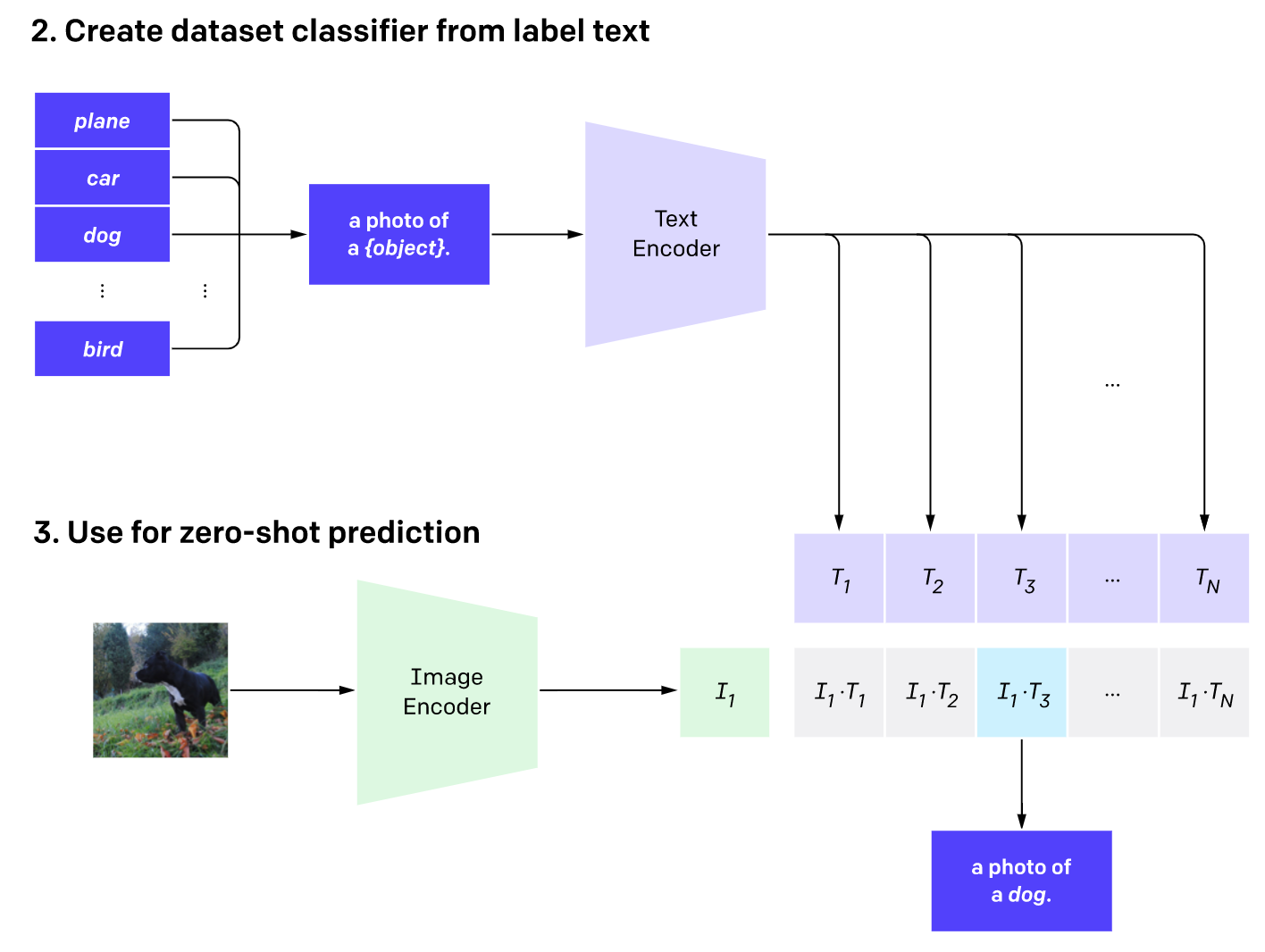 首先要将每个候选类别用文本形式表示(例如,“狗的照片”),再输入到文本编码器中。接下来,将要分类的图像输入到图像编码器中。然后计算从图像获取的向量与候选类别得到的多个向量之间的余弦相似度。最后,将具有最高相似度的类别作为输出结果。