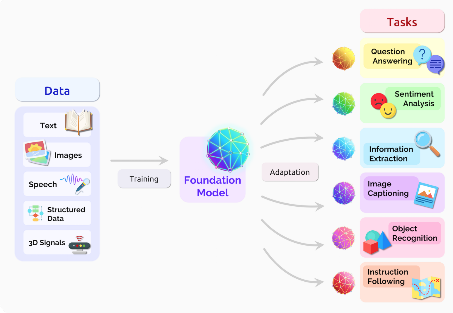 简单来说,有了基础模型,就可以把原先“单一任务,单一模型”转变为“多样任务,通用模型”,无需再为每个任务单独设计模型。后面这张图就很好地概括了基础模型。