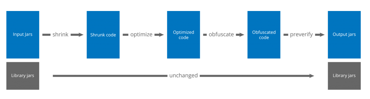 ProGuard主要有混淆、裁剪、优化这三大功能,它的整个处理流程是:
