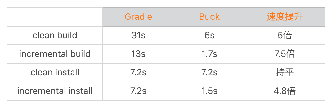 - 极致的性能追求。Buck和Bazel的性能的确比Gradle更好,内部包含它们的各种编译优化。但是它们或多或少都有一些定制的味道,例如对Maven、JCenter这样的外部依赖支持的也不是太好。
