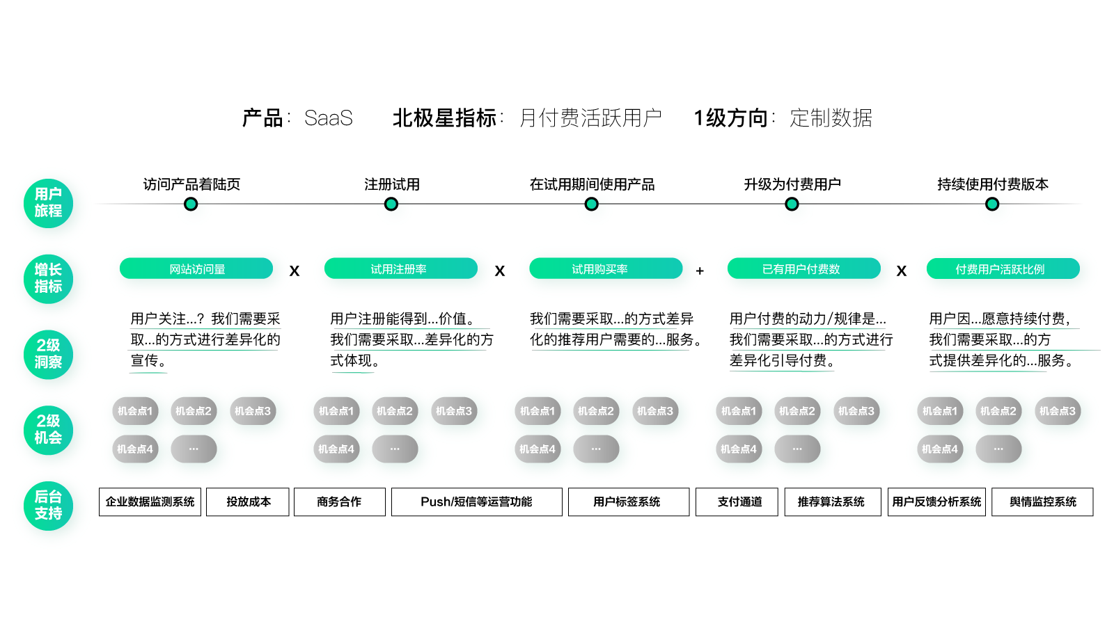 用户旅程及对应的增长指标可以是:访问产品着陆页(网站访问量)→注册试用(试用注册率)→在试用期间使用产品(试用购买率)→升级为付费用户(已有用户付费数)→持续使用付费版本(付费用户活跃比例)。