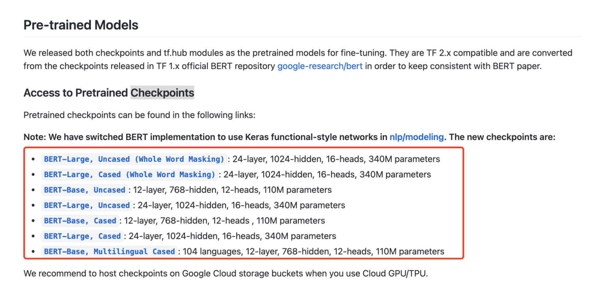 对照这节课的任务,我们选择的是“BERT-Base, Multilingual Cased”的版本。从GitHub的介绍可以看出,这个版本的checkpoint支持104种语言,是不是很厉害?当然,如果你没有多语言的需求,也可以选择其他版本的,它们的区别主要是网络的体积不同。