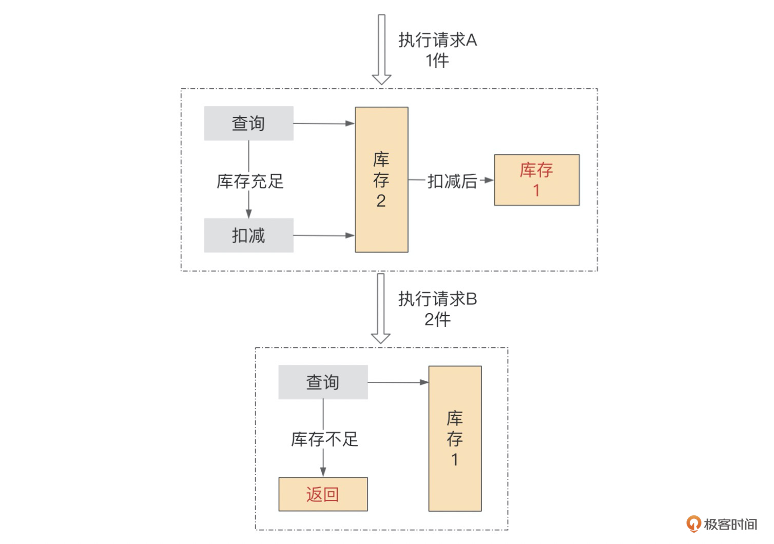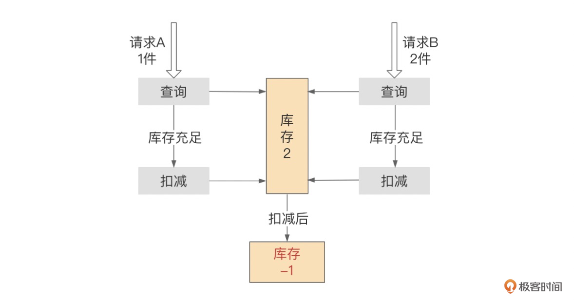 举个简单的例子,比如现在活动商品有2件库存,此时有两个并发请求过来,其中请求A要抢购1件,请求B要抢购2件,然后大家都去调用活动查询接口,发现库存都够,紧接着就都去调用对应的库存扣减接口,这个时候,两个都会扣减成功,但库存却变成了-1,也就是超卖了。
