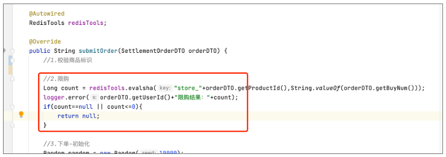 方法入参为活动商品库存key以及单次抢购数量,并在内部调用Lua脚本执行库存扣减操作。看起来是不是很简单?在写完底层核心方法之后,我们只需要在下单之前,调用该方法即可,具体如下图所示: