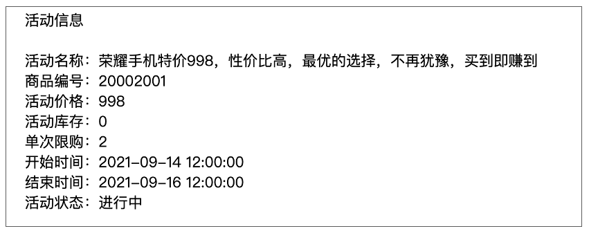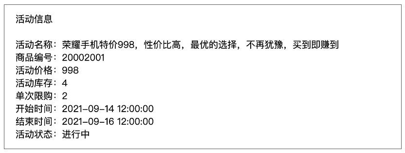我们按照模拟思路,先创建一个活动,数据库库存为4,然后调用活动开始接口,活动信息如下图所示: