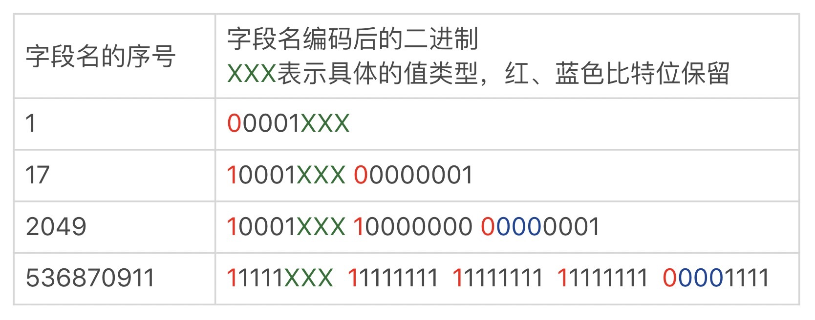 Protobuf可以用1到5个字节来表示一个字段名,因此,每个字节的第1个比特位保留,它为0时表示这是字段名的最后一个字节。下表列出了几种典型序号的编码值(请把黑色的二进制位,从右至左排列,比如2049应为000100000000001,即2048+1)。