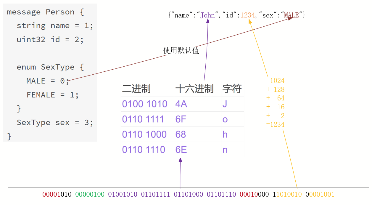 我们再来看id:1234这个数字是如何编码的。其实Protobuf中所有数字的编码规则是一致的,字节中第1个比特位仅用于指示由哪些字节编码1个数字。例如图中的1234,将由14个比特位00010011010010表示(1024+128+64+16+2,正好是1234)。