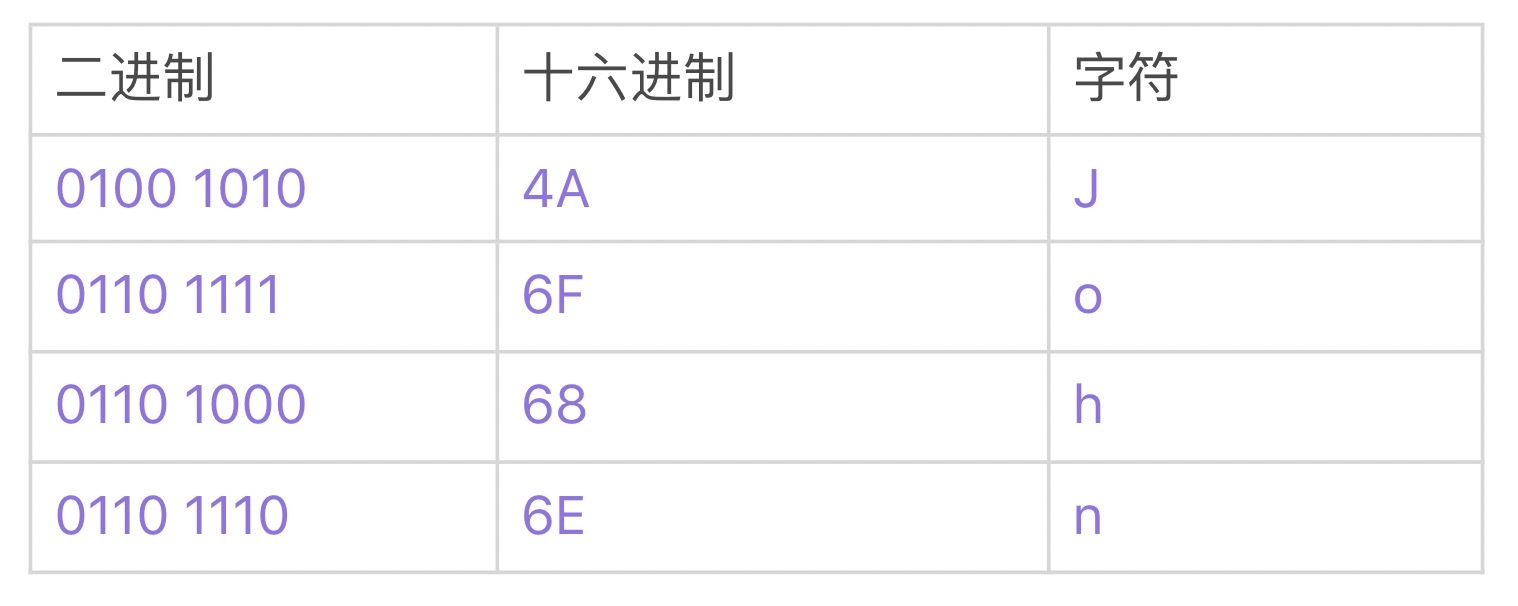 字符串用Length-delimited方式编码,顾名思义,在值长度后顺序添加ASCII字节码即可。比如上文例子中的John,对应的ASCII码如下表所示:
