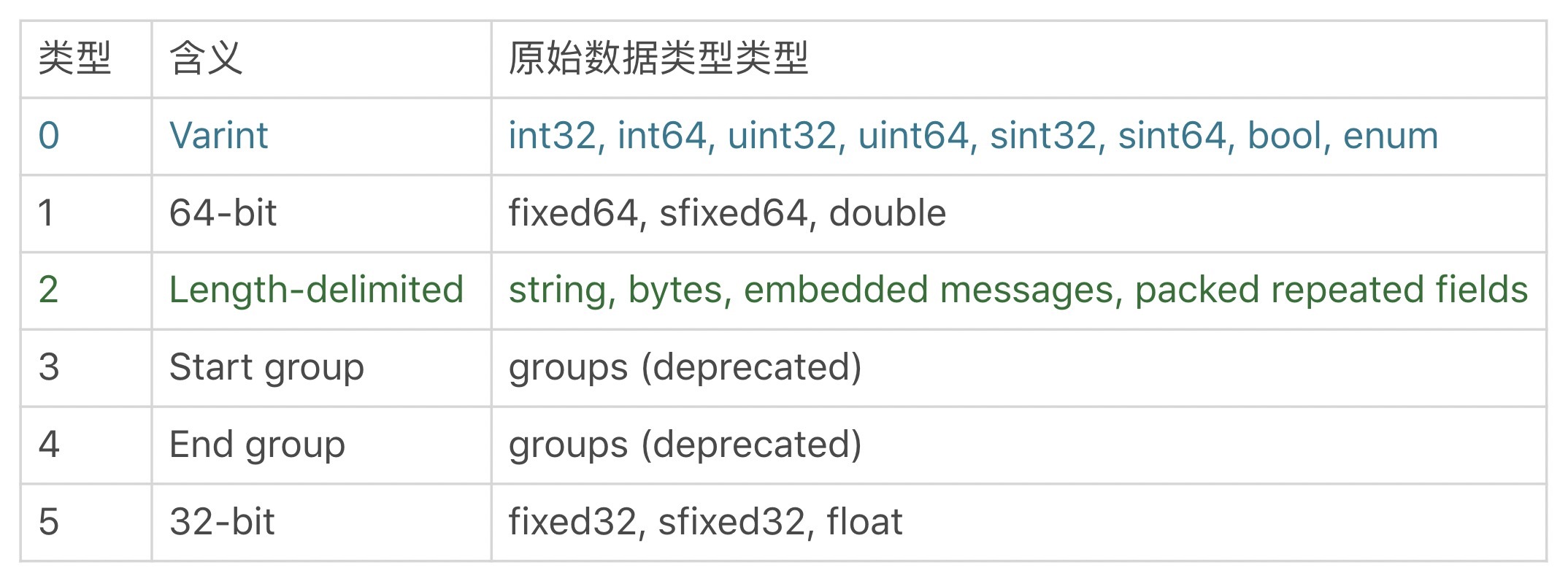 Protobuf对不同类型的值,采用6种不同的编码方式,如下表所示: