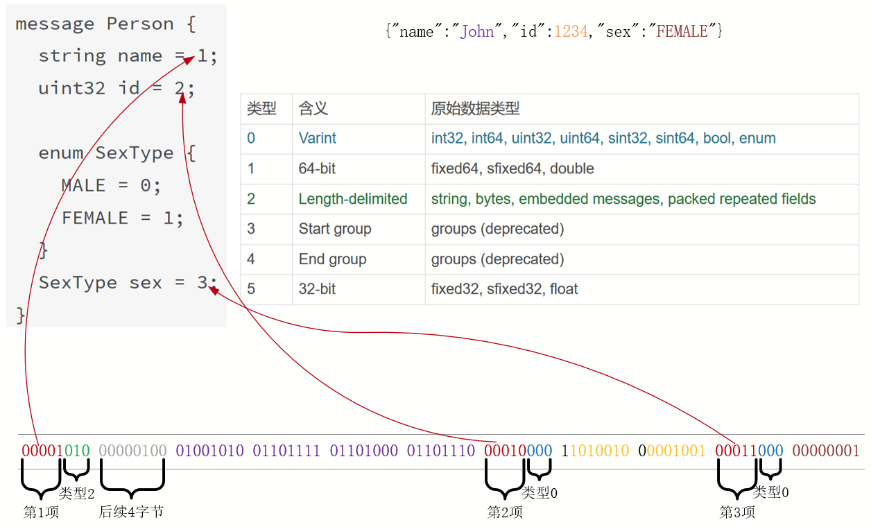 从图中可以看出,Protobuf是按照字段名、值类型、字段值的顺序来编码的,由于编码极为紧凑,所以分析时必须基于二进制比特位进行。比如红色的00001、00010、00011等前5个比特位,就分别代表着name、id、sex字段。