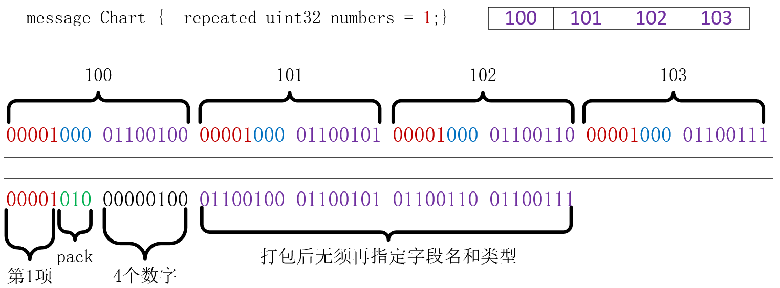 在Protobuf2版本中,需要显式设置 [packed=True] 才能使用打包功能,而在Protobuf3版本中这是默认功能。