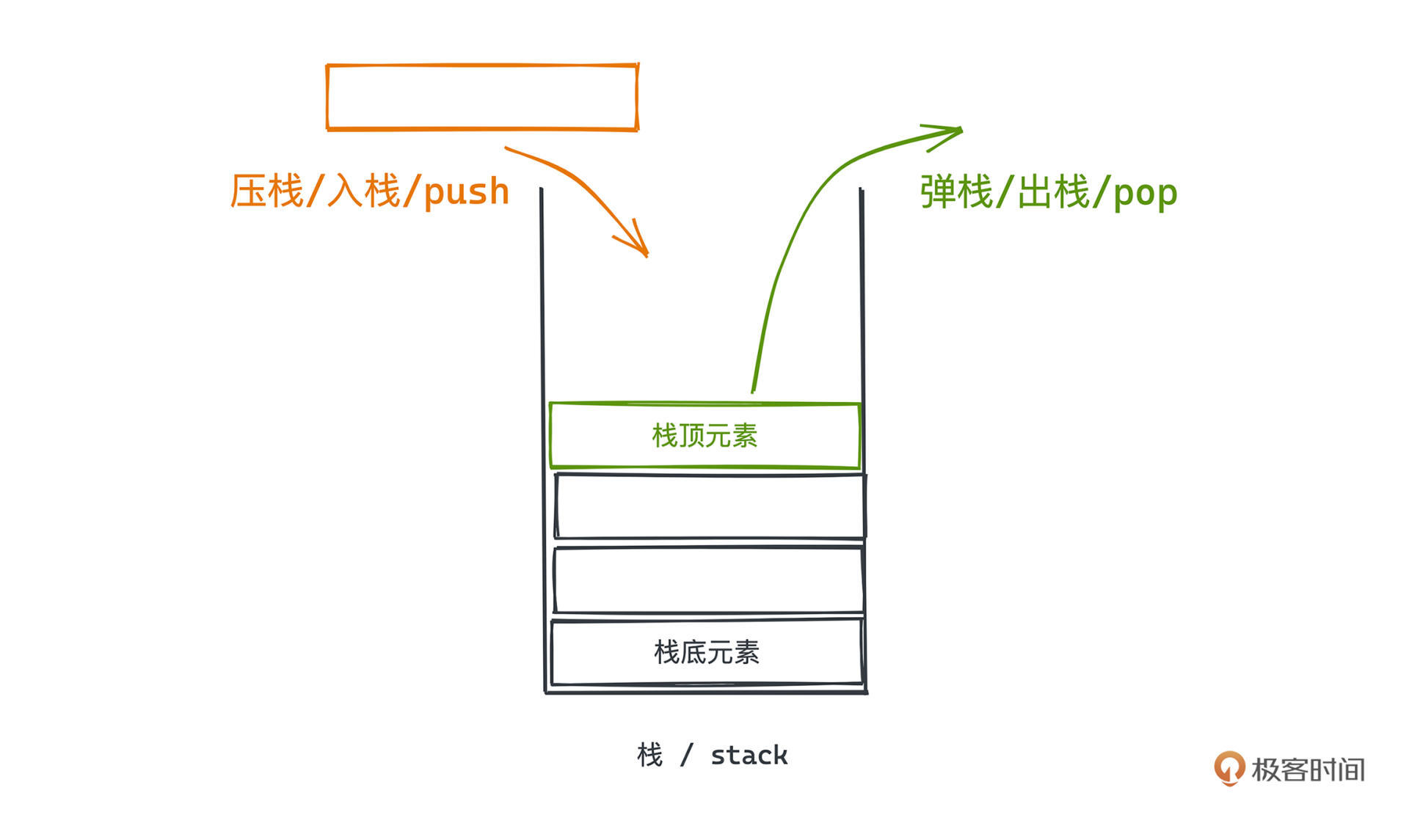 和队列一样,我们也可以将栈理解成一种有约束的序列式数据结构,但是不同于FIFO的队列,栈的约束在于,插入和移除元素的操作,都只能在该数据结构的一端进行。栈对外暴露的插入和删除接口,我们一般称为push和pop,操作的那一侧,也称为栈顶,不能操作的那一侧则叫做栈底。